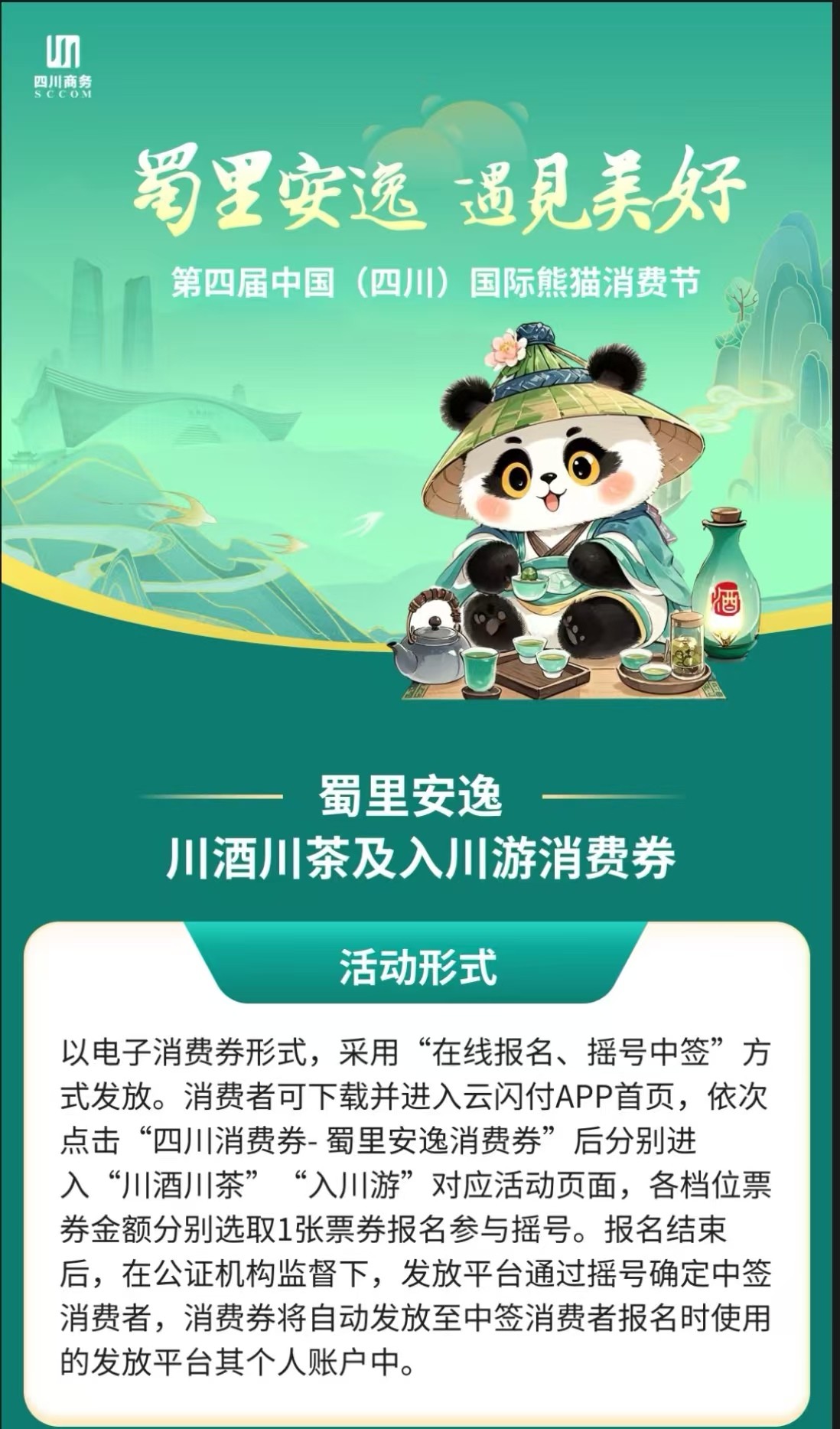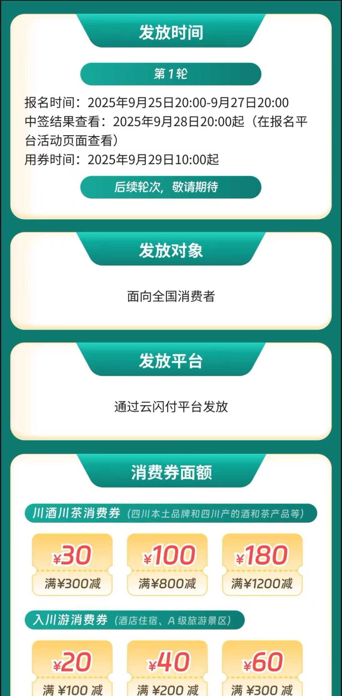 ▶省多少?该大礼包共分充电、餐饮、住宿三类消费券,其中——1.充电消费券设置两种面额:消费满30元抵用10元面值券1张;消费满60元抵用20元面值券1张。2.餐饮消费券设置两种面额:消费满100元抵用20元面值券1张;消费满150元抵用30元面值券1张。3.住宿消费券设置两种面额:消费满200元抵用40元面值券1张;消费满300元抵用60元面值券1张。(需要注意的是,三类消费券与2025年第一批“蜀里安逸”消费券不叠加使用。)国庆中秋大假将至,“美到犯规”的川西,无疑选择自驾前往才能完整领略到每一处景色。当然,有细心的人会发现,此次大礼包主要覆盖的是318国道沿线的雅安和甘孜两地。不过,从最美国道——318国道穿行进入,领上消费券一路赏美景、品美食、畅心游玩,岂不是几全齐美?