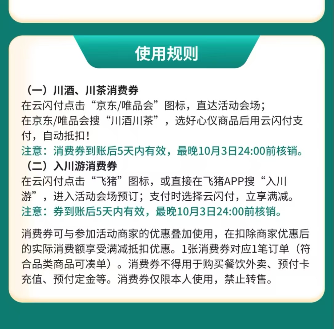 ▶怎么领?消费券以电子券形式在“云闪付”APP发放,9月30日至10月8日每日8:00—22:00通过该平台限量发放,次日24:00结束核销,未使用的消费券自动作废。消费券先领先得,活动期结束或补贴资金用完即止。每人每日限领充电、餐饮和住宿消费券各1张,活动期间充电、餐饮和住宿三类消费券分别最多可领取3张,消费券发放数量共计10万张。